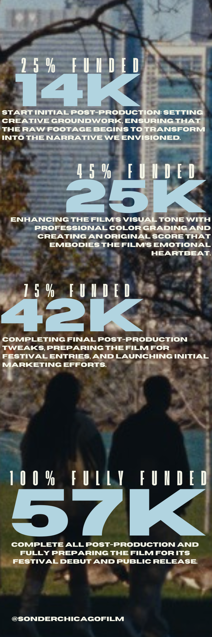 Our goal with this fundraiser is to reach our initial $25,000 goal, which will cover the bare essentials of post-production—allowing us to complete the film at a foundational level. However, our stretch goal of $57,120 will ensure we can fully realize our vision by not only finishing the film but also securing archival materials, equitably compensating our team, and giving Sonder the promotion it deserves. With these funds, we can submit to major festivals, reach a wider audience, and spark meaningful conversations about home, identity, and change. Created by a team of young Chicagoans, Sonder is more than just a film—it’s a movement. It’s about returning to the place that shaped you, seeing it with fresh eyes, and rediscovering its beauty. At its heart, this story is about resilience, memory, and finding love in the everyday.